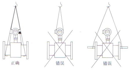 在搬運(yùn)和吊裝傳感器時(shí),應該将吊索套在(zài)傳感器兩端🌈頸部(bù)位🈲置或吊環上,切(qiē)勿在測量管内套(tào)入管💃🏻棒進行吊裝(zhuang),以免損🧑🏾🤝🧑🏼壞襯裏(見(jian)圖)。在吊裝和搬運(yun)電磁流量計過程(chéng)中,必須防止傳感(gǎn)器襯裏和接線盒(he)受碰撞而損壞。