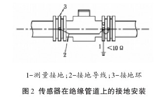 傳感器安裝(zhuāng)在塑料管道(dao)或内壁有絕(jue)緣塗層、襯裏(lǐ)的管道上,兩(liǎng)端應安裝接(jie)地環(或帶有(yǒu)接地電極的(de)金屬短管),然(rán)後用導線連(lian)接,使管内流(liu)動的介質與(yu)大地短路,具(jù)有零電位🔱(見(jiàn)圖 2)。