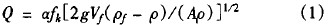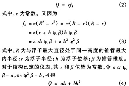 式(shi)中:Q爲體(tǐ)積流量(liang);α爲流出(chū)系數; ?k爲(wei)浮子最(zuì)大直徑(jìng)與☔其同(tóng)♈高♉度錐(zhuī)管橫截(jié)面之間(jiān)的環隙(xì)面積;g爲(wei)重力加(jia)速度;v?爲(wèi)浮💁子的(de)體積🌐;ρ?爲(wei)浮👈子的(de)密度; ρ爲(wei)被測流(liú)體的密(mi)度;A爲浮(fú)子的最(zui)大截🌂面(miàn)積。