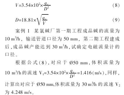 氯堿(jian)行業工藝介質(zhi)多爲酸、堿、鹽等(deng)電解質,基于電(dian)磁流量計 的測(ce)量原理,決定了(le)其在該行業的(de)應用有很大的(de)優勢。本文介紹(shào)的選型原則具(jù)有通用性,但力(lì)求在具體的每(měi)一項目的選型(xing)時,較側重于結(jié)合氯堿行業的(de)特點。 1電磁流量(liang)計的測量原理(lǐ)及特點 1.1測量原(yuan)理 電磁流量計(ji)的測量原理見(jiàn)圖1 電磁流量計的(de)測量原理基于(yu)法拉第電磁感(gǎn)應定律,導電液(yè)體在磁場中作(zuò)切割磁力線運(yun)動時,導體中産(chǎn)生感應電勢,其(qi)感應電勢(流量(liàng)信号)E爲: E=KBDV(1) 式中:K—儀(yí)表常數; B—磁感應(ying)強度; V—流體平均(jun)流速,m/s; D—測量管内(nèi)徑,mm。 測量流量時(shi),導電性液體以(yi)速度V流過垂直(zhí)于流動方向的(de)磁場,在測量電(diàn)極上感應出一(yi)個與平均流速(sù)成正比的電壓(yā),其感應電壓信(xìn)号通過一對或(huò)一對以上與液(yè)體直接接觸的(de)電極檢出,并經(jing)由轉換器的智(zhì)能化處理,然後(hou)送LCD顯示或轉換(huan)成4~20mADC标準信号、頻(pín)率信号和Hart等協(xié)議通訊的輸出(chu)。 1.2特點 (1)流量的測(cè)量不受流體的(de)密度、黏度、溫度(du)、壓力和電導率(lǜ)變化的影響,傳(chuan)感器感應電壓(ya)信号與平均流(liu)速呈線性關系(xì),測量精度高。 (2)電(diàn)磁流量計可在(zài)一種典型介質(zhi)(一般爲水)下标(biāo)定或校準,而用(yong)于其他介質(液(ye)體)時無需附加(jia)修正。 (3)測量管道(dào)内無可動部件(jiàn)及阻流體,因此(cǐ),沒有附加的壓(yā)力損失,在大口(kou)徑測量中節約(yue)泵能耗是選用(yòng)它的重要原因(yin),特别在工藝管(guǎn)道壓力不高或(huò)依靠水頭自流(liú)情況下采用更(geng)爲有利。 2電磁流(liú)量計的選型 2.1選(xuǎn)用條件 選用電(diàn)磁流量計的前(qian)提條件是被測(cè)流體必須具備(bei)一定的導電性(xìng),電導率>5μS/cm。被測介(jiè)質不應含有較(jiao)多的鐵磁性介(jiè)質及大量氣泡(pao)。 液體的電導率(lü)可查閱有關手(shǒu)冊,缺少現成數(shu)據則可取樣用(yong)電導率儀測定(dìng),但有時也有從(cóng)管線上取樣去(qù)實驗室測定認(ren)爲可用,而實際(jì)電磁流量計卻(que)不能工作的情(qing)況。這是由于測(cè)電導率時的液(yè)體與管線内的(de)液體有差别,譬(pi)如液體在運送(song)的過程中吸收(shou)了大氣中的Cl2、CO2或(huò)NOX,生成鹽酸、碳酸(suan)或硝酸,從而導(dǎo)緻電導率增大(da),這在氯堿廠尤(yóu)爲常見。 電導率(lǜ)若接近下限值(zhi)有可能出現晃(huang)動現象,諸如低(dī)度蒸餾水、去離(li)子水等。通常認(ren)爲能穩定測量(liàng)的電導率比下(xià)限值要高一兩(liang)個數量級。 2.2口徑(jing)的确定 口徑的(de)确定主要是根(gēn)據工藝上的體(ti)積流量,結合工(gong)藝管道的尺寸(cun),選擇合适的流(liu)量計口徑,使通(tōng)過傳感器的流(liu)體平均流速在(zai)合适的範圍内(nei)(通常爲0.3~10.0m/s)。 具體地(dì)說,測黏度不高(gao)的潔淨介質,經(jīng)濟流速是1.5~3.0m/s。測易(yì)結晶、黏度稍大(dà)或有沉積物的(de)溶液時,應适當(dang)地提高流速,3.0~4.0m/s爲(wèi)宜,起到自潔,防(fang)止粘附、沉積等(deng)作用;測礦漿等(děng)磨損性流體時(shi),應适當降低流(liú)速,以1.0~2.0m/s爲宜,以降(jiàng)低對襯裏和電(diàn)極的磨損。測接(jie)近閥值的低導(dǎo)電率液體,應盡(jin)可能使用較低(di)流速(略小于0.5m/s,最(zui)大不超過l.0m/s),以減(jiǎn)輕因流速高,流(liú)動噪聲增加而(ér)出現儀表輸出(chu)晃動的現象。實(shi)際應用很少超(chao)過7m/s,超過10m/s則更不(bu)推薦采用。 口徑(jìng)計算方法:對于(yú)公式(2),取π=3.14,則公式(shì)(2)演變爲 qv=2.826×10-3D2V(5) 假設被(bèi)測流體流速範(fan)圍爲0.3~10.0m/s,則 qvmin=8.478×10-4D2(6) qvmax=2.826×10-2D2(7) 對于通(tōng)過某一口徑流(liu)量計的流體,其(qí)最小流和最大(da)流量必須符合(he)公式(6)、(7)的計算結(jié)果。 V1處在允許的(de)0.3~10.0m/s流速範圍的低(dī)端,而V2處在較經(jing)濟的流速點,因(yīn)此,可選用流量(liang)計的口徑爲覫(pang)50mm,與工藝管道口(kǒu)徑相同。 有時管(guan)道内的流速偏(pian)低或從儀表價(jià)格上考慮,可選(xuan)用口徑較小的(de)流量計,這不僅(jin)可使儀表運行(hang)在較好的工作(zuo)狀态下,還可以(yǐ)降低儀表的投(tou)資費用,此時就(jiu)要在傳感器兩(liǎng)端加裝異徑管(guǎn)。 案例2某長距離(li)輸水管線工程(cheng),輸送管道口徑(jìng)爲800mm,最大流量爲(wei)1000m3/h,确定電磁流量(liàng)計的口徑。 根據(ju)公式(8)計算出管(guan)道内液體的流(liu)速: 圓整後,可選(xuan)用500mm口徑的電磁(cí)流量計,并在流(liú)量計兩端加裝(zhuāng)異徑管。經公式(shì)(8)驗算,通過電磁(cí)流量計的流體(tǐ)流速爲1.416m/s。 爲了在(zài)加裝異徑管後(hou)不過多影響流(liu)速場的分布,不(bu)影響流量計的(de)精度,通常要求(qiu)異徑管的中心(xīn)錐角不大于15°,越(yuè)小越好。 有的選(xuǎn)型資料詳細地(di)給出了異徑管(guan)壓力損失的計(ji)算,這通常是沒(mei)有必要的。當異(yi)徑管的中心錐(zhui)角不大于15°時,總(zǒng)的壓力損失通(tōng)常爲100Pa以下。 譬如(rú)此例,若選異徑(jing)管的中心錐角(jiǎo)α=8°。經計算(詳細計(jì)算方法請查閱(yue)相關資料,或咨(zi)詢工藝專業),異(yi)徑管總的壓力(li)損失爲69.73Pa。 此例中(zhōn