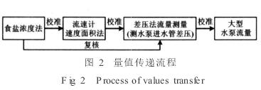 泵站曾按ISO标準(zhǔn)規定位置布置(zhi)26台流速計,測量(liàng)大型水泵3.5m×1.5m矩形(xing)出🙇🏻水流道平均(jun)流速,以校準用(yòng)差壓法測量泵(bèng)進水道差壓的(de)🍓流出系數,測量(liang)流速在1.2~1.3m/s之間。期(qī)間還用食鹽濃(nóng)度法校準流速(su)計面積法,在實(shi)驗過程中再用(yòng)㊙️食鹽濃度法複(fú)核流速計面積(jī)法的數據[3]。量值(zhí)傳遞流程如圖(tú)2所示。