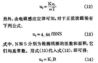 式中u 2爲積(ji)分電路的輸出(chū)電壓, u 1爲積分電(diàn)路的輸入電壓(yā),即是檢測線圈(quān)上所取得的感(gan)應電壓,ω爲磁場(chang)角頻率, ω=2πf,f爲勵磁(cí)頻率,K= R2/(R1+ R2),T爲時間常(chang)數,其表達式爲(wei)T= R1 R2C/( R1+ R2),設計時使ω2T2>>1,則式(shi)(11)可改寫