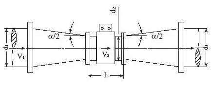爲了在安(ān)裝異徑管後(hòu)不過多影響(xiang)流速的分布(bu),不影👨❤️👨響電磁(ci)流量計的精(jīng)度,要求異徑(jìng)管的中心錐(zhuī)角 α不大于15°,越(yue)☂️小越好。這樣(yàng)可⭐把異徑管(guan)視爲直管段(duan)的一部分。