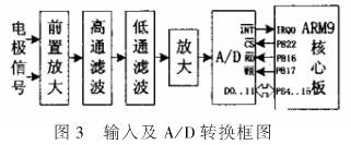 檢測輸(shu)入模塊(kuai)包括差(chà)分測量(liàng)放大器(qì)、低通和(hé)高通濾(lü)波器、增(zēng)益放大(da)器以及(ji)A/D轉換電(dian)路,如圖(tú)3所示。圖(tu)3輸入及(jí)A/D轉換框(kuàng)圖。