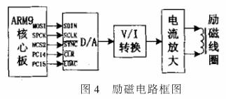 的(de)勵磁電(dian)路的任(ren)務是向(xiang)勵磁線(xiàn)圈提供(gong)一穩定(ding)的驅動(dòng)電流。電(dian)流波形(xing)爲方波(bō)、三值方(fang)波和梯(ti)形波[11]等(děng)形式,波(bo)形變化(huà)的目的(de)是結合(he)信号處(chu)理電路(lu),分析在(zai)不同勵(lì)磁方式(shi)下電磁(ci)流量計(jì)的精度(du)、零點穩(wěn)定性和(hé)抗能力(li)等多項(xiàng)指标。該(gāi)電路由(you)核心闆(pǎn)的SPI2口輸(shu)😘出數字(zì)量,經過(guò)D/A轉換形(xíng)成模拟(ni)信号,經(jīng)V/I轉換激(jī)勵和帶(dai)有電流(liú)負反👈饋(kui)的電流(liú)放大器(qì)輸出,适(shì)合各種(zhong)勵磁波(bo)形的變(bian)化。結🛀🏻構(gòu)框圖如(ru)圖4。D/A轉換(huan)電路采(cǎi)用AD7243芯片(pian)[5],實☔現12位(wèi)的SPI同步(bu)串行輸(shu)入,-5~+5V的雙(shuang)極性輸(shū)出。與ARM9核(hé)心闆的(de)SPI2口對接(jie),如圖4所(suo)示。