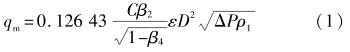式中(zhōng):qm爲流體的質量流(liú)量,kg/h;C爲流出系數(經(jīng)過實流标定可知(zhī));ε爲可膨脹性系數(shu)(對液體ε=1);β=db/D爲直徑比(bǐ),其中d,=√D-d2爲工作條件(jiàn)下節流件最小截(jie)面處的等效流通(tong)直徑(d爲錐體外徑(jìng),外徑),mm;D爲工作條件(jiàn)下儀表測量管的(de)内徑,mm;△P爲從節流件(jian)上、下遊取壓口處(chù)測取的差壓,kPa;ρ爲儀(yi)表安裝處上遊側(ce)工作條件下的流(liú)體密度,kg/m3