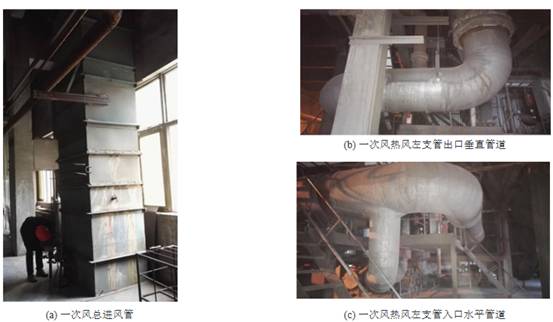 爲所(suo)研究一(yi)次風熱(rè)風左支(zhi)管出口(kǒu)垂直管(guan)道和一(yī)次風熱(rè)♊風左支(zhī)管入口(kǒu)水平管(guǎn)道。根據(jù)三号鍋(guō)爐一次(ci)風🐆熱風(fēng)左支☀️管(guan)管道參(cān)數建立(lì)三維模(mo)型,見圖(tú)1(d),圖♌中标(biao)注位置(zhì)爲原旋(xuán)翼式流(liú)量計安(ān)裝🏃♀️位置(zhi)。