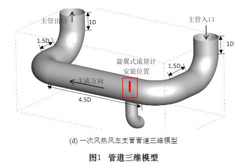 某熱(rè)電廠一(yi)次風總(zong)進風管(guǎn)後方進(jin)入空氣(qì)預熱器(qì)加熱後(hou),分成左(zuǒ)右兩條(tiao)支管進(jin)入左右(yòu)風室,由(you)于左右(yòu)支管結(jie)構對稱(chēng),因此隻(zhī)取其中(zhong)左風室(shì)支管進(jìn)行建模(mó)研㊙️究。該(gāi)測量管(guǎn)道管徑(jing)D爲800mm,管道(dào)具體尺(chǐ)寸見圖(tu)1(d)。