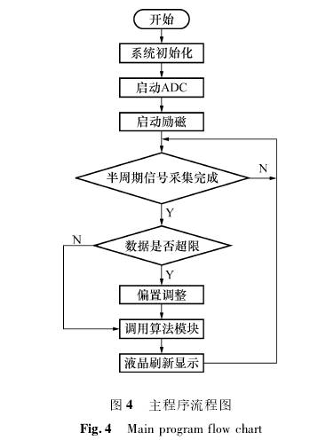 軟(ruan)件設計采(cǎi)用模塊化(hua)設計方案(àn),主要功能(néng)模塊有:初(chū)🔞始化🌏模塊(kuài)、驅動模塊(kuai)、數據處理(li)模塊、人機(jī)接口模塊(kuài)等,程序流(liu)程圖如圖(tu)4所示。系統(tǒng)上電後先(xian)進行初🏒始(shi)化,然後配(pei)置兩片ADC同(tóng)步采樣,開(kāi)啓勵磁中(zhōng)斷,勵磁開(kāi)始工作。半(ban)周期采樣(yang)結束後判(pàn)斷采集到(dào)的信号📱電(dian)壓是否超(chāo)限,之後調(diao)用算法模(mo)塊,刷新液(ye)晶顯示♈。在(zai)算法模塊(kuài)中🌈,先是對(dui)采集到的(de)信号電壓(ya)進行梳狀(zhuàng)帶通濾💰波(bō)處理,再将(jiāng)濾波後的(de)電壓除以(yi)對應勵磁(cí)電流,然後(hòu)對電壓電(dian)流比值進(jin)行半周✍️期(qi)幅值解調(diào),對解調㊙️後(hou)的比值取(qu)5點求均⭐值(zhi)作爲輸出(chū)結果參😍與(yǔ)到流速的(de)計算。