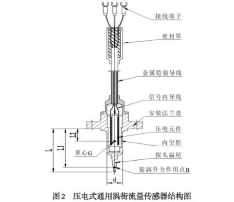 爲此,采用了(le)壓電傳感器與旋(xuán)渦發生體(三角柱(zhu))分離型的結構方(fang)案,即研制了種小(xiao)尺寸懸臂梁凹結(jie)構的壓電式通用(yòng)渦街流量傳感器(qì)(簡稱壓電傳感器(qì)),壓電傳感器結構(gòu)如圖2所示,由安裝(zhuang)法蘭盤、探頭扁尾(wei)、壓電元件、铠裝📱導(dǎo)線、密封罩、接線端(duān)子等組成。壓電傳(chuán)感器通過中部的(de)安裝法蘭盤與流(liu)量計殼體固定,下(xia)部🔴的懸臂梁置于(yu)旋渦發生體内的(de)孔洞中,壓電傳感(gan)器的探頭扁尾通(tong)過發生體兩側的(de)側孔獲取旋渦升(shēng)力作用。并傳感出(chū)相應的渦街流量(liàng)信号。在懸🈲臂梁内(nei)部,壓💃🏻電元件機械(xie)封裝在探👌頭内空(kong)腔中,空餘空腔🏃🏻則(zé)無其它填充物。壓(ya)電元件通過剛性(xìng)結構的🔞铠裝導線(xiàn)将信号輸出到外(wài)部的接線端子上(shàng),再通過接線端子(zi)🛀🏻将信号輸出到外(wài)部信号處理電路(lu)🚶♀️進行處理。當管道(dao)流體因漩渦發生(shēng)體産生渦街後,伴(bàn)随産生的交變升(sheng)力F,作用在懸臂梁(liang)下💋部的探頭扁尾(wei)上,懸臂梁産生變(bian)形并迫使内部的(de)🌈壓電元件也🈲同步(bu)變形,從而産生出(chu)與交‼️變升力對應(ying)的電荷,通過後續(xu)的一系列信号處(chu)理電路,最終獲得(dé)流量信息。