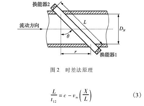 時差法原理(lǐ)如圖2所示,超聲(sheng)波逆流從換能(neng)器1送到換能器(qi)2的傳播速度c被(bèi)流體流速?m所減(jian)慢,爲
