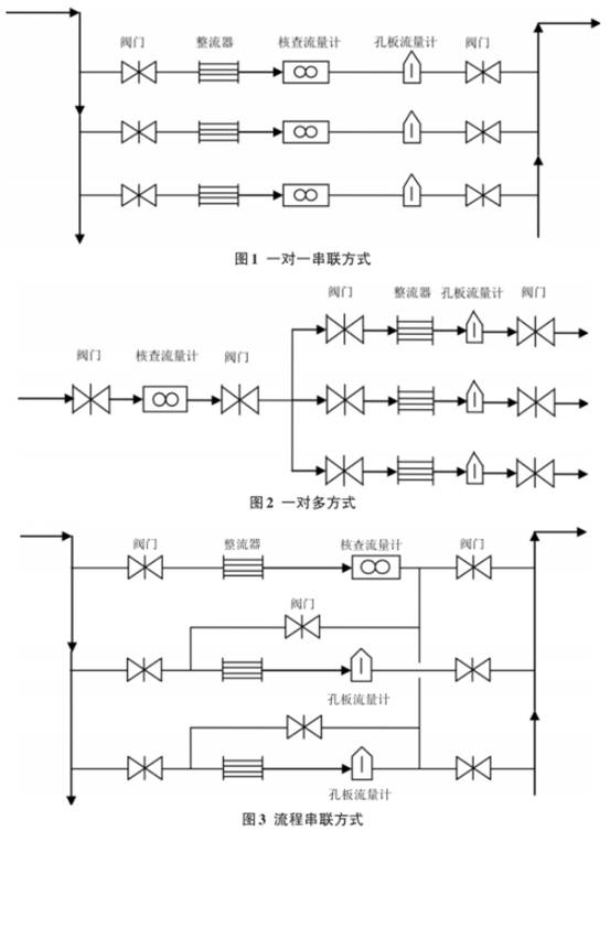 方式(shì)3:流程串(chuan)聯設置(zhì)核查流(liú)量計,将(jiang)-一台核(he)查流量(liang)計與㊙️多(duō)台孔闆(pan)流量計(jì)并聯安(ān)裝,流程(chéng)串聯,利(li)用流程(cheng)切換,對(duì)不同孔(kǒng)闆流量(liàng)計分别(bie)進行流(liu)量核查(chá),如📞圖3所(suǒ)示。這種(zhong)方式屬(shu)于🈲暫時(shi)性核查(chá)方式,目(mù)的與方(fang)式2相同(tóng),但因場(chǎng)地限🏃♀️制(zhì)等問題(tí)✔️,是可選(xuǎn)取的另(lìng)一種方(fang)式。