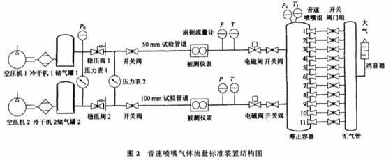 本文(wen)試驗裝(zhuāng)置采用(yòng)正壓法(fa),工作流(liu)量範圍(wéi)爲工況(kuang)2.5~666m3/h,工作壓(ya)力範圍(wéi)爲表壓(yā)0.1~0.5MPa,裝置結(jie)構圖如(rú)圖2所示(shi)。工作原(yuan)理是:首(shou)😘先由☀️空(kong)壓機将(jiāng)大氣中(zhong)的空氣(qi)送人管(guan)道,經冷(lěng)幹機除(chú)去🏃♀️水氣(qi)後⁉️打人(ren)高壓儲(chu)氣罐中(zhong),待儲氣(qì)🐉罐壓力(li)升高到(dào)-定值🏃🏻♂️之(zhi)後,調節(jie)穩壓閥(fá)使其下(xia)遊管🏃道(dao)壓力穩(wěn)定🧑🏽🤝🧑🏻在合(hé)适值,經(jīng)穩壓閥(fa)調節後(hou)進入試(shi)驗💯管道(dào)的高壓(ya)氣體先(xian)後流經(jīng)渦街流(liu)量計、滯(zhì)止💋容器(qì)🔴、音速噴(pēn)嘴組、彙(huì)氣管、消(xiao)音♌器後(hòu),最終通(tong)向大氣(qi)。其中,音(yīn)速噴嘴(zuǐ)組由安(ān)裝📱在滞(zhì)止容器(qì)下遊的(de)11個不同(tong)喉徑音(yin)速噴嘴(zui)并聯而(ér)成,通過(guo)控制音(yin)速噴嘴(zuǐ)下遊的(de)👉開關閥(fá)門,可以(yǐ)任意選(xuan)擇音速(su)噴嘴的(de)組合方(fāng)式,以🐪達(dá)到改變(bian)被測儀(yi)表流量(liang)的目的(de)。通過對(dui)滞止容(róng)器上溫(wen)📞度變送(sòng)器T、壓力(li)變送器(qi)P,信号采(cai)集,代人(ren)公式(5)便(biàn)可得到(dao)通過音(yin)速噴嘴(zuǐ)的質量(liang)流量,亦(yì)即流過(guò)渦街流(liu)量計處(chù)的質量(liàng)流量。通(tōng)過測量(liàng)渦街流(liú)量計處(chù)的溫度(dù)T和壓力(li)P,可以計(ji)算出工(gōng)作狀态(tai)下空氣(qi)密度,進(jin)而得到(dao)實際體(ti)積流量(liàng)。再根據(ju)相同時(shí)間間隔(gé)内渦街(jiē)流量計(jì)輸出脈(mò)沖的檢(jian)測,可最(zuì)終實現(xian)對渦街(jie)流量計(jì)儀表系(xì)數等流(liu)量特性(xing)的研究(jiū)。