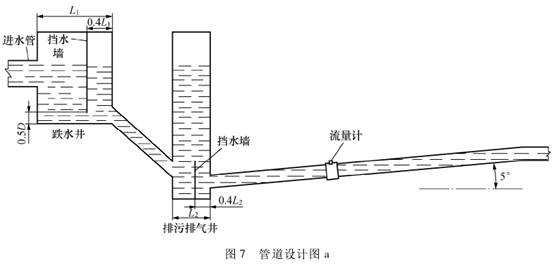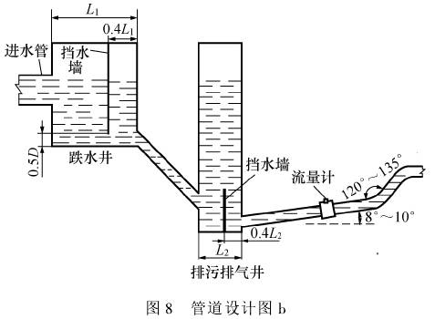 爲保(bao)證大口徑流量(liang)計正常計量,其(qi)前後直管段、介(jiè)㊙️質滿🍓管、不能存(cun)氣等要求是需(xū)要滿足的。但現(xiàn)場安🌈裝條件各(gè)不相同,針對不(bú)同情況,從正确(que)計量的角✍️度出(chu)發,本文提出了(le)兩種管道♍鋪設(she)及♌流量計安裝(zhuang)的建議,分别如(ru)圖7和圖8所示。管(guǎn)道直徑爲D,跌水(shui)井長👅度爲L,配置(zhì)擋㊙️水牆,擋水牆(qiáng)底部距井底約(yuē)0.5D,牆體距離💛右壁(bi)約0.4L,;排污排🔱氣井(jǐng)爲正方形,尺寸(cùn)爲1.5D×1.5D.即圖示👨❤️👨L2=1.5D.内置(zhi)擋水牆,擋水牆(qiáng)頂與.上遊㊙️管頂(ding)平齊,牆體距離(lí)右壁✊約⛷️0.4L2。