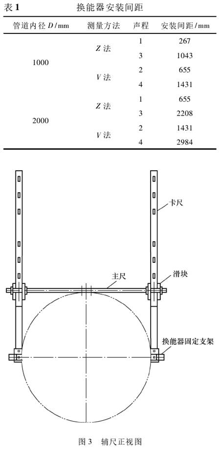 由于待測管徑(jing)巨大,管道截面(miàn)爲非标準圓形(xíng)。以DN1800管道爲例,不(bu)同位置的外徑(jìng)最大可差35mm,極限(xian)情況下,若傳感(gǎn)器安裝位置的(de)直徑與平均直(zhí)徑的差值恰好(hǎo)爲外徑最大差(cha)❄️即35mm,僅截面面積(jī)一項帶來的誤(wù)差就達3.8%。,傳統的(de)圍尺測量直徑(jing)的方🌏法獲得的(de)❓是平均管徑,但(dàn)無法指導檢測(cè)人員将換能器(qì)安♋裝在平均管(guan)徑位置;即使在(zai)換能器之間增(zēng)加滑軌,也隻能(neng)保證😍換能器安(an)裝間距準确,不(bú)能保證換能器(qi)連線的投🐆影與(yǔ)軸線平行。因此(cǐ),本文設計了一(yī)套便于攜帶、易(yì)于現場組⛹🏻♀️裝的(de)輔助設備即輔(fu)尺,用于定位、安(ān)裝換能器,基本(ben)結構如圖3、圖4所(suo)示。輔尺測量管(guan)🔅徑範圍:800~2200mm,其主尺(chǐ)測.量不确定度(dù)U=0.5mm(k=2)。能夠測量管道(dào)截面任意位置(zhì)⛷️的外徑,保證換(huan)能器連線♌平行(háng)于管道軸心,較(jiào)好地解決換能(néng)器安裝位置不(bu)精準帶來的問(wen)題,盡可能地降(jiang)低測量過程中(zhōng)的人爲影響,實(shí)用性強。