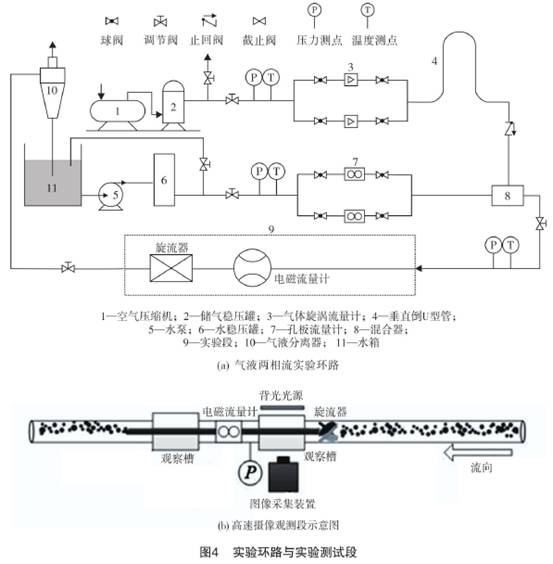 實(shi)驗在空(kong)氣-水兩(liang)相流實(shi)驗回路(lù)中進行(hang),以驗證(zheng)所提出(chū)的測量(liang)🏃方法的(de)可行性(xing)。實驗環(huán)路及實(shí)驗段布(bu)置如圖(tu)4所示,在(zài)實驗段(duan)安裝了(le)旋流器(qì)和電磁(ci)流量計(jì)