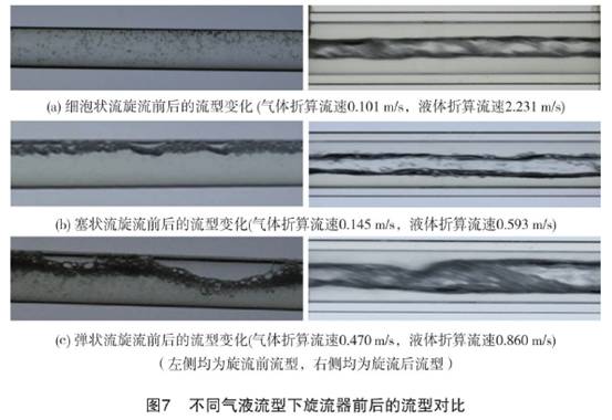 針對氣(qi)液兩相(xiàng)來流分(fen)别爲細(xi)泡狀流(liú)、塞狀流(liu)和彈狀(zhuàng)流時❄️,實(shí)驗過程(chéng)中觀察(chá)了旋流(liú)器上下(xià)遊流型(xing)的♋演變(biàn),旋流器(qi)前後的(de)流型變(biàn)化如圖(tu)7所示。從(cong)圖7可以(yǐ)看出,在(zài)各人口(kou)流型下(xia),都可以(yi)形成旋(xuan)流核心(xīn)環空流(liú)動結構(gou)🌈。當入口(kǒu)流型爲(wèi)細泡狀(zhuang)流時,旋(xuán)流器下(xia)遊的氣(qi)柱直徑(jìng)保持相(xiang)對穩📞定(dìng)值;當人(ren)口流型(xíng)爲塞狀(zhuàng)❤️流時,旋(xuán)流器🏃🏻♂️下(xia)遊的氣(qi)柱直徑(jìng)保持相(xiang)對穩定(ding),與細泡(pao)狀流區(qū)别不大(da);當人口(kǒu)💃🏻流型爲(wèi)彈狀流(liu)時,由于(yu)截面内(nei)氣量的(de)劇烈變(biàn)💋化導緻(zhì)旋流後(hòu)氣♍柱🥵直(zhí)徑随氣(qi)體體積(ji)的🈲增大(da)而增大(dà),但界面(miàn)仍然清(qing)晰。