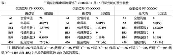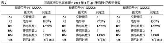 該三台流量(liàng)計經使用18個(ge)月後于2025-12-15因計(jì)量誤差太大(da)導緻氣化爐(lú)跳車。經拆體(tǐ)檢查和原始(shi)安裝數據比(bi)較發🈲現三💁台(tái)漿液型電磁(cí)流量計防護(hu)裏襯整體平(ping)均磨損了0.8毫(hao)米的厚度🈚,但(dan)感應電極因(yin)出廠加裝了(le)碳化鎢防護(hù)膜而保🎯護特(te)好導緻了流(liú)量計電級與(yǔ)裏襯物理與(yǔ)㊙️幾何結構的(de)不匹配。爲了(le)不影響正常(cháng)經廠家傳真(zhen)确🌈認“要求用(yong)角向磨光機(jī)将碳化🍓鎢防(fáng)護膜平均打(da)磨0.8毫米的厚(hòu)♉度後對流♍量(liàng)計重新标定(ding)☎️和整定參數(shù)”。我公司嚴格(gé)按廠家要求(qiú)進行檢修标(biao)定和參數🤟整(zheng)定現将标定(ding)時整🈲定好的(de)參數附後見(jian)表2以供參考(kao)。