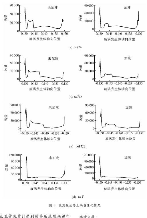 首(shou)先對渦(wō)街流量(liàng)傳感器(qì)沒有液(ye)相加入(ru)時渦街(jiē)壁面.上(shàng)渦♊量㊙️的(de)🙇🏻變化情(qíng)況進行(háng)了記錄(lu)。圖4反映(ying)的是當(dang)入口🔞速(sù)度爲20m/s時(shí),一個✍️周(zhou)期内不(bú)同時刻(ke)旋渦發(fā)生體壁(bì)面,上渦(wō)量的變(bian)化情🌍況(kuang),以及當(dāng)氣體中(zhong)注入液(yè)體含率(lü)爲0.1%時旋(xuán)渦發生(shēng)體上一(yī)個✉️周期(qī)内不同(tong)時刻的(de)渦量變(biàn)化。未加(jia)入液相(xiang)時可以(yi)看到旋(xuán)渦在旋(xuan)渦發♉生(sheng)體上從(cong)産生到(dào)逐漸長(zhǎng)大最後(hòu)從旋渦(wo)發生🔞體(tǐ)上脫落(luo)的整個(gè)過程,在(zài)開始時(shí)刻邊界(jie)層在旋(xuán)渦發生(shēng)體的銳(ruì)邊開始(shi)卷積😘形(xing)成旋渦(wo),随後旋(xuán)渦逐漸(jian)變大,渦(wo)量比初(chu)始時相(xiang)對減💋小(xiǎo),最後旋(xuan)渦從旋(xuan)渦發生(shēng)體😘上脫(tuō)落,旋渦(wo)發生體(ti)壁面.上(shàng)的渦量(liàng)變爲零(ling)。由圖4進(jìn)🤞行比較(jiao)可以明(ming)顯地看(kan)出,在加(jiā)入液相(xiang)以後液(ye)相的存(cún)在影響(xiǎng)了氣體(ti)邊界層(ceng)在壁面(mian)上的卷(juan)積,旋渦(wō)發生體(ti)上的🌈渦(wō)量明顯(xian)減小。