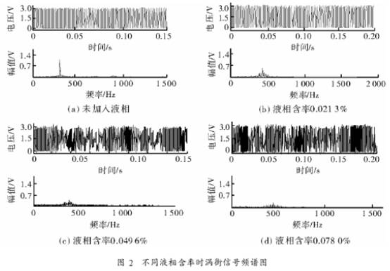 實(shí)驗的過(guo)程中保(bao)持氣相(xiang)流量爲(wei)141m3/h,對應的(de)流速爲(wèi)20m/s,管道中(zhong)液相體(ti)積含率(lü)分别爲(wèi)0.0106%、00213%、0.0355%、0.0496%、.0.0638%、0.0780%、00922%。以5000Hz的頻(pín)率對不(bú)同液相(xiang)🧑🏽🤝🧑🏻含率下(xià)電荷放(fang)大器産(chan)生的正(zheng)弦信号(hao)進行采(cai)樣,每次(cì)采樣10組(zǔ)數據🔴,每(mei)組數據(jù)有104個采(cai)樣點🌐,然(rán)後把得(dé)到🌍的采(cai)樣點進(jìn)行傅立(lì)葉變換(huan),得到不(bú)同液相(xiàng)含率下(xia)渦街産(chǎn)生的頻(pin)率.,不同(tong)液相含(han)率時渦(wo)🌍街信号(hao)的頻✨譜(pǔ)圖如圖(tú)2所示。