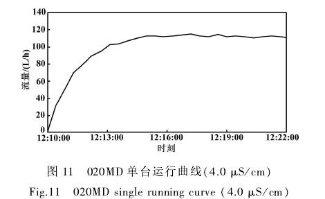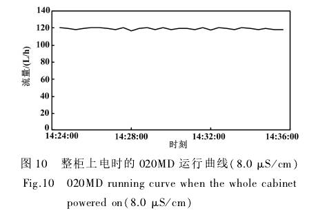 由前述可(ke)知,流體電導率的(de)高低對采集的信(xìn)号強度有直接影(ying)響。當電導率低時(shí),電極反饋的信号(hào)較弱受到幹擾的(de)影響💚越明顯,低電(diàn)導率的流量測量(liang)對信号采集的👨❤️👨要(yào)求更高。壽期末的(de)測量介質電導率(lǜ)約爲4.0μS/cm。對👨❤️👨此,将電導(dǎo)率降至4.0μS/cm,運行一段(duàn)時間後,觀測到020MD單(dan)台運行穩定,運行(háng)曲線如圖11所示。