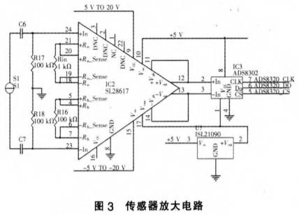 電路如圖3所示。IC2(SL28617)前(qian)置放大器用于放(fàng)大傳感器送來的(de)反映🌏流量大小的(de)電壓信号,改.變圖(tu)中Rm和R。的阻值👄大小(xiao)🌍,可以改變該運算(suan)放大器的增益。S1是(shi)勵磁信号🌈源,R17、R18是輸(shu)人偏置💋電阻,運放(fang)的9腳和16腳分别供(gong)+5V電壓,接在運放IC2輸(shu)出端的IC3(ADS8320)是16位高速(sù)的A/D轉換器,其轉換(huàn)速度👌可達16kHz/s,接在前(qián)置放大器與A/D轉換(huan)器之間的IC12(ISL21090)是三端(duan)穩壓器。