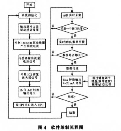 在編制礦用(yong)電磁流量計軟件(jian)的過程中,首先要(yao)求🧑🏾🤝🧑🏼對系✍️統進行👌初(chū)始化、再對CPU進行初(chu)始化,由CPU輸出勵磁(cí)脈沖方波信号,控(kòng)制LM8200産生勵磁電流(liú)驅動勵磁線圈。采(cai)集傳感器信号,使(shǐ)傳⁉️感器送出反映(yìng).流量大小的電壓(yā)信号,經過IC2前置放(fàng)大器放大該信号(hào),再經16位A/D轉換器和(he)SPI串口送人單片機(ji)進行處理,在單片(pian)機中要進行A/D實時(shi)采📧集、實時濾波和(he)數據拼接和數據(jù)傳送🧡,最後經過D/A轉(zhuǎn)換後,經過IC4轉換成(chéng)4~20mA電流信号直接輸(shu)出🤩或者以電壓形(xing)式輸出。