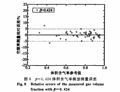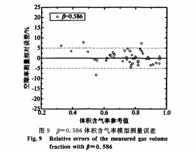 實驗在(zai)體積含(hán)氣率爲(wèi)0.32~0.96範圍内(nèi)進行,對(duì)流體流(liu)經雙錐(zhui)流🥰量計(jì)時所産(chan)生的前(qian)差壓進(jin)行了采(cǎi)集,提取(qu)差壓波(bo)動信号(hào)中的特(tè)征值R',通(tong)過模型(xing)式(7)計算(suàn)得出體(tǐ)💋積含氣(qì)率值,模(mo)型測量(liang)誤差如(ru)圖8和9所(suǒ)示,體積(jī)含氣率(lü)的相對(duì)誤差基(ji)本在±5%以(yǐ)内。
