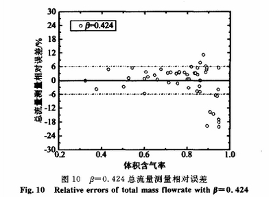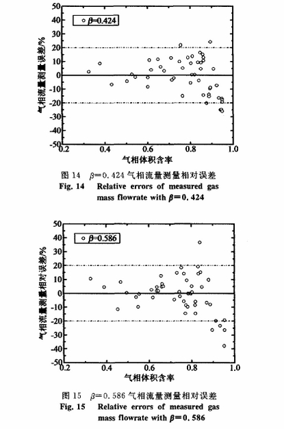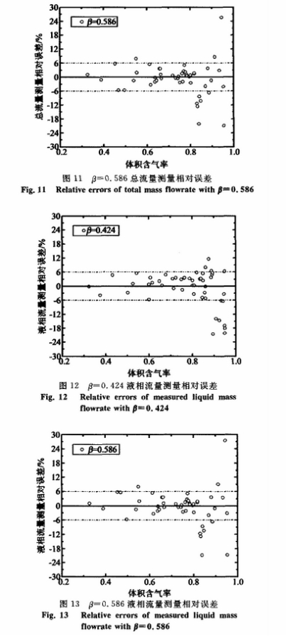 總流(liú)量測量(liàng)相對誤(wù)差圖中(zhōng)可看出(chu),對于氣(qì)液兩相(xiang)✂️流,其分(fèn)相流的(de)參數測(cè)量具有(yǒu)重要的(de)工程意(yì)義。可💔以(yi)根據公(gong)式(7)和測(cè)量出的(de)體積含(hán)氣率值(zhí)由公式(shì)(2)得到幹(gan)度值,從(cóng)而實現(xian)對😘氣液(ye)兩相流(liu)的分相(xiang)流測量(liang)。液相流(liu)量測量(liàng)誤差如(rú)圖12和13所(suǒ)示,在實(shí)驗範圍(wei)内的相(xiàng)對誤差(cha)基本在(zài)±6%以内,說(shuō)💔明該測(ce)量模型(xíng)在該工(gōng)況下具(ju)有較好(hao)的測量(liang)效果。因(yin)爲在實(shi)驗所用(yòng)氣液兩(liǎng)相流中(zhōng),氣體在(zài)總流量(liang)中所占(zhan)的比例(lì)較小,所(suo)以液相(xiàng)流量測(cè)量誤差(chà)分⛱️布結(jie)果與總(zǒng)流量相(xiàng)似。