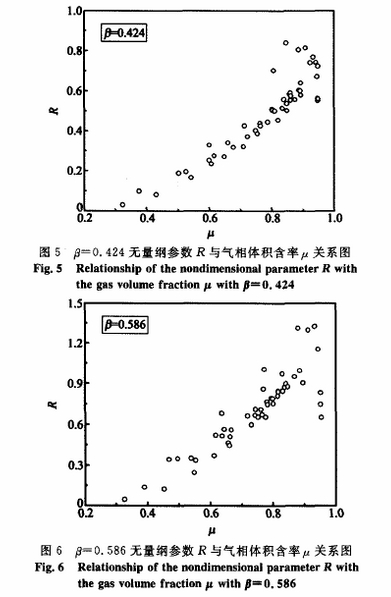 實驗所(suo)用水平(ping)管道管(guǎn)徑爲50mm,進(jìn)行氣液(yè)兩相流(liú)實驗并(bing)🔞采集差(cha)♋壓波動(dòng)信号,圖(tu)5和6爲等(děng)效直徑(jìng)比爲0.424和(hé)0.586的雙錐(zhui)流量計(jì)無量綱(gāng)參數R與(yǔ)體積含(hán)氣率μ的(de)數值點(dian)分布