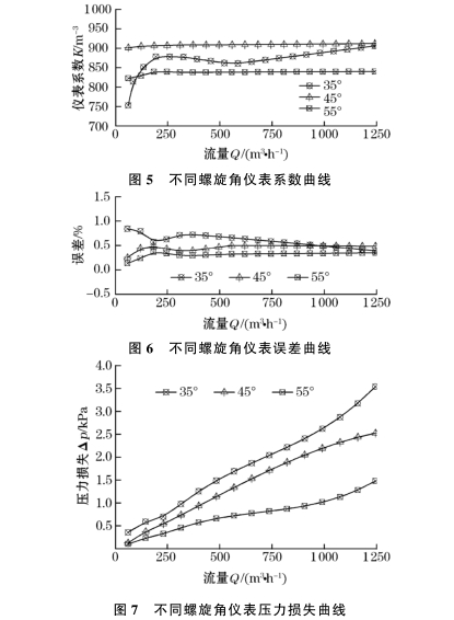 如(ru)圖6所示,采用(yòng)螺旋升角爲(wèi)55°渦輪的流量(liang)計誤差基本(ben)✍️穩定💘在0.4%左右(yòu),45°渦輪在0.5%左右(you),而35°葉輪流量(liang)計誤差曲線(xiàn)存在較大波(bō)動,而且最大(da)誤差超過0.8%,計(ji)量精度較差(chà)。