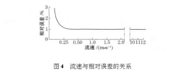 由于現場灌漿泵(beng)泵量多爲6m³/h(100L/min),故EMF的量(liàng)程選爲100L/min,由EMF的測量(liàng)原理可知[4],其流速(su)的下限由.同噪聲(shēng)或偏移的信噪比(bǐ)S/N(信号與噪💚聲)來決(jué)定,上限則由測量(liang)管内襯裏的磨損(sun)和配管的經濟速(su)度等來決定印。由(yóu)于水泥漿液中帶(dài)有水泥固體顆粒(li),考慮到對EMF襯🏃♀️裏和(hé)電極的磨損,選用(yòng)流速≤5m/s,另一方🧑🏽🤝🧑🏻面水(shui)泥漿液🤟又具有易(yì)粘附、沉澱、結垢的(de)特性,故EMF測量管内(nèi)的流速應不🤩低于(yú)0.5m/s,以起到對電極和(hé)内襯的自清掃作(zuo)用。一般當測量管(guan)内實際流速<0.1m/s時,感(gǎn)應電動勢已變得(dé)🌈十分微弱(零點幾(ji)μV~幾μV),此時噪聲.的影(ying)響逐步✨變爲主導(dao),甚至淹沒信号電(diàn)動勢4],由流速與相(xiàng)對誤差的關系圖(tú)(圖4)可知,爲了保證(zhèng)儀表的檢測精🈲度(du),流速應大于0.5m/s.故推(tuī)薦使♻️用流速範圍(wei)爲0.5~5m/s.