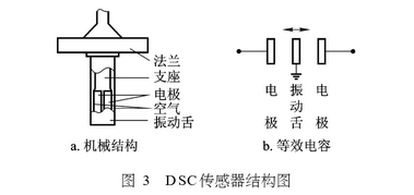 DSC傳感器爲外置(zhi)懸臂式結構(圖3),獨(du)立于.儀表旋渦發(fa)生體但⭕又徑向插(chā)入發生體的中心(xin)孔中,并與兩側導(dǎo)壓孔連通,以檢測(ce)卡門旋渦壓力的(de)變化。它實質是一(yi)個電容式機-電轉(zhuan)換器。