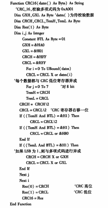 在(zai)Modbus标準通信中,對于(yu)即将被傳輸消息(xi)中的字符串必須(xu)💛進行CRC校💔驗,目的是(shì)發現數據傳輸過(guò)程中可能出現的(de)錯誤。常用的💛校驗(yan)多項式有CCITT和CRC-16,本系(xì)統采用CRC-16,其多項⭕式(shi)爲G(x)=xl6+xI5+x2+1,實🔞際應用時取(qu)其👨❤️👨反序。