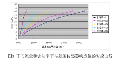 固定節流孔(kǒng)(即出液孔)寬(kuan)度爲5mm,在油水(shuǐ)兩相流時,打(da)開集流器集(ji)🔞流,改變總流(liú)量和含油率(lǜ),差壓傳感器(qì)的響應值如(rú)圖☔3所示。