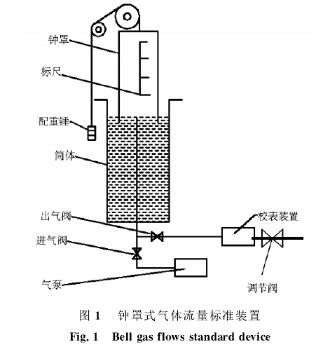 式中,δv———被(bei)檢流量計(ji)示值相對(duì)誤差,Q′———被檢(jiǎn)流量計的(de)顯示值,Q———實(shi)際流量值(zhí).鍾罩式氣(qi)體流量标(biao)準裝置如(ru)圖1所示.
