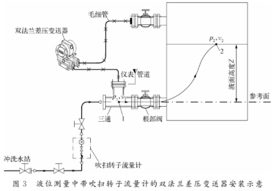煤氣(qì)化裝置(zhi)中液體(ti)吹掃的(de)典型應(yīng)用是差(chà)壓法測(ce)量氣化(huà)爐💞激冷(leng)室液位(wei)。由于氣(qi)化爐激(jī)冷室内(nei)的激冷(lěng)水爲複(fu)雜混合(hé)物,既含(hán)有易堵(dǔ)塞的固(gu)體顆粒(li).物,也含(hán)有💯腐蝕(shí)性🤟成分(fen),因此一(yi)般采用(yòng)雙法蘭(lan)差壓變(biàn)送器進(jìn)行測量(liàng)。變送器(qi)負壓側(ce)法蘭隔(ge)膜與激(jī)冷室内(nèi)的氣相(xiàng)接觸,無(wu)需吹掃(sǎo),而變送(song)器正壓(ya)側法蘭(lan)隔膜則(ze)與激冷(lěng)水✉️接觸(chù),必須引(yǐn)入沖洗(xi)水以防(fang)止取壓(yā)口堵塞(sai)影響液(ye)位🔞測量(liàng),并延長(zhang)變送器(qi)的壽命(ming)。帶吹掃(sǎo)轉子流(liú)量計的(de)雙🐅法蘭(lan)差壓變(bian)送器安(ān)裝如圖(tú)3所示。