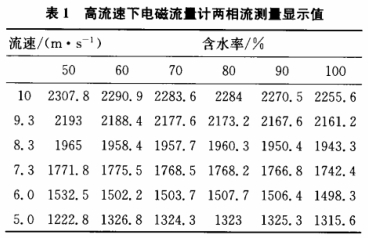 在模(mó)拟井實(shí)驗中,采(cai)用集流(liú)的内流(liú)式電磁(cí)流量計(jì)測量兩(liǎng)相流,該(gāi)電磁流(liu)量計檢(jian)測電極(ji)測量信(xìn)号是利(li)用法拉(la)第電磁(cí)感應定(dìng)律。檢測(cè)電極安(ān)裝在流(liú)量測量(liàng)傳感器(qi)流體輸(shū)送管道(dào)上,将通(tong)過傳感(gan)器導管(guan)中的油(you)氣水多(duō)相流流(liú)體的流(liú)速轉變(biàn)成檢測(cè)電極兩(liang)端的感(gǎn)應電勢(shì)信号。當(dāng)通過電(diàn)磁流量(liang)計的總(zǒng)流量較(jiao)大時,一(yī)定的含(hán)水率範(fan)圍内,例(li)如含水(shuǐ)率在50%~100%時(shi),高流速(su)下電磁(ci)流量計(jì)流量測(ce)量值基(ji)本在某(mǒu)一值附(fu)近。表1所(suǒ)示爲高(gāo)流速下(xià)電磁流(liu)量計兩(liang)相流測(cè)量顯示(shi)值。表1中(zhōng),各列表(biǎo)示不同(tóng)含水率(lǜ)下電磁(ci)流量計(jì)測量結(jié)果,各行(háng)表示不(bú)同流速(su)下測量(liàng)結果(電(dian)磁流量(liang)計輸出(chū)爲響應(yīng)頻率,單(dān)位爲Hz),下(xià)面從理(lǐ)論上對(dui)這一問(wen)題進行(háng)研究。