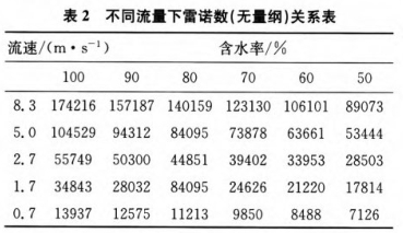 雷諾數(shu)是表征(zhēng)流體流(liu)動情況(kuang)的無量(liang)綱數。雷(léi)諾數較(jiào)小時,黏(nian)滞力對(duì)流場的(de)影響大(da)于慣性(xìng)力,流場(chang)中流速(sù)的擾動(dong)會因黏(nián)滞力而(ér)衰減,流(liú)體流動(dong)穩定,爲(wèi)層流;反(fan)之,若雷(léi)諾數較(jiào)大時,慣(guàn)性力對(duì)流場的(de)影響大(da)于黏滞(zhì)力,流體(ti)流動不(bu)穩定,流(liú)速的微(wēi)小變化(hua)容易發(fā)展.增強(qiang),形成紊(wěn)亂、不規(guī)則的湍(tuan)流流場(chǎng)。流态轉(zhuǎn)變時的(de)雷諾數(shu)值稱爲(wei)臨界雷(léi)諾數。一(yi)般管道(dào)雷諾數(shu)Re<2100爲層流(liu)狀态,Re>4000爲(wei)湍流狀(zhuang)态,Re=2100~4000時爲(wèi)過渡狀(zhuang)态。表2列(liè)出不同(tóng)含水率(lü)與不同(tong)流速下(xia)的雷諾(nuo)數。