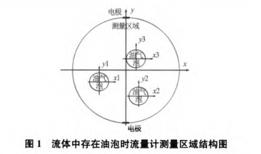 當電(dian)磁流量(liang)計中心(xīn)橫截面(mian)内含有(yǒu)M(M=0,1,2.,-.)個油泡(pào)時傳感(gǎn)器的權(quan)重函數(shu)分布情(qíng)況,本文(wén)算例設(shè)定M=3權重(zhòng)函數分(fèn)布情況(kuàng)計算方(fāng)式。圖1爲(wèi)電磁流(liu)量計傳(chuan)感器截(jié)面内存(cún)在3個球(qiú)形油泡(pào)時的結(jie)構模型(xing)圖。其中(zhōng),x軸與y軸(zhóu)與圖1描(miao)述--緻,圖(tu)1中隻顯(xiǎn)示了測(cè)量區域(yù)部分,測(cè)量區域(yu)流體中(zhong)存在3個(ge)油泡。y正(zheng)半軸、負(fù)半軸與(yu)管壁的(de)交點是(shi)流量計(jì)的電極(ji)位置。