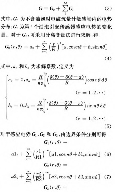 式中(zhōng),R爲電磁(ci)流量計(ji)半徑的(de)長度值(zhí);მG/an爲電勢(shi)在半徑(jing)方向上(shàng)的導數(shu);δ(θ)爲電勢(shì)G在流量(liàng)計管壁(bi)處所滿(mǎn)足的條(tiao)件,其值(zhí)僅在電(dian)極表面(miàn)處不爲(wèi)0。當流體(tǐ)中存在(zài)油泡時(shí),G表達式(shì)爲