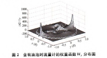 當(dang)電磁流(liu)量計流(liu)體中存(cun)在3個油(you)泡時,G=G+G1+G2+G3圖(tu)2顯示了(le)流量計(ji)流體截(jié)面中存(cún)在3個不(bú)重疊的(de)油泡時(shí),流量計(jì)截面内(nei)部權重(zhòng)函數wy分(fen)布圖;從(cong)式(2)以及(ji)仿真圖(tu)中可以(yi)發現油(you)泡所在(zài)位置權(quan)重函數(shù)值是0。當(dang)然,存在(zài)多個油(you)泡分布(bu)在不同(tong)位置流(liú)體中時(shí)權重函(hán)數分布(bu)情況也(ye)可以用(yong)上述方(fāng)法計算(suan)。