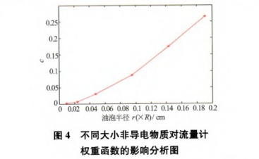 圖(tu)4爲不同(tong)大小非(fēi)導電物(wù)質對流(liu)量計權(quán)重函數(shù)的影響(xiǎng)分析圖(tu)。圖4中橫(heng)軸爲非(fēi)導電物(wù)質半徑(jìng),縱軸爲(wei)權重函(han)數的影(yǐng)響因子(zi)c。從仿真(zhēn)結果可(ke)以看出(chu)流體中(zhōng)的非導(dao)電物質(zhi)半徑較(jiào)小時,對(dui)電磁流(liu)量計的(de)權重函(han)數影響(xiang)越小。在(zài)本例中(zhong),當流體(ti)中非導(dao)電物質(zhi)小于0.02R時(shi),對電磁(cí)流量計(jì)的權重(zhong)函數分(fèn)布幾乎(hu)沒有影(yǐng)響。