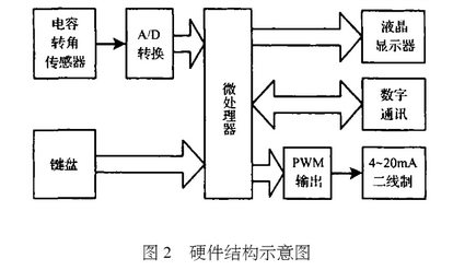 硬件(jian)結構如(ru)圖2所示(shi),浮子的(de)位置變(biàn)化通過(guò)擺杆變(biàn)爲角度(dù)變化後(hòu),由電容(róng)角位移(yí)傳感器(qì)轉換爲(wei)電壓信(xìn)号,微處(chù)理器通(tong)過内部(bu)集成的(de)A/D轉換器(qi)将該信(xin)号變爲(wèi)數字量(liàng)進行流(liú)量計算(suan)并累計(jì),将計算(suan)結果送(song)液晶顯(xian)示器顯(xiǎn)示,并通(tong)過控制(zhì)PWM輸出,将(jiāng)當前瞬(shun)時流量(liàng)以4~20mA二線(xian)制方式(shi)遠傳;鍵(jian)盤用于(yu)外部參(can)數設置(zhi);數字通(tōng)訊接口(kǒu)與計算(suan)機連接(jie)進行内(nei)部參數(shu)設置。