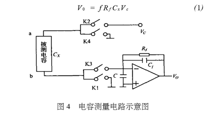 電容(róng)測量電(diàn)路基于(yu)充放電(dian)原理,該(gai)電路具(jù)有抗寄(jì)生電容(róng)、雜散電(dian)容等分(fèn)布電容(róng)特性。圖(tú)4爲電容(rong)測量電(diàn)路示意(yi)圖,Vc爲充(chong)電電壓(ya),開關K1、K2、K3、K4受(shòu)時鍾脈(mo)沖控制(zhi)。一個完(wan)整的測(ce)量過程(chéng)包括充(chōng)放電兩(liang)個周期(qi):K1與K2導通(tong),K3與K4關斷(duan)爲充電(dian)狀态,将(jiang)被測電(diàn)容G充電(dian)到Vc;K1與K2關(guān)斷,K3與K4導(dao)通爲放(fàng)電狀态(tài),被測電(diàn)容中的(de)電荷由(you)電荷檢(jian)測器檢(jiǎn)出,輸出(chu)正比于(yú)被測電(diàn)容的電(dian)壓信号(hao)V0