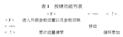 AD轉換(huàn)器采集(ji)角位移(yí)傳感器(qi)輸出電(dian)壓信号(hào),采集時(shi)間間隔(ge)爲10ms,采集(jí)的電壓(yā)值經數(shu)字濾波(bo)後,用于(yu)流量計(jì)算;鍵盤(pan)處理模(mó)塊采用(yong)中斷方(fang)式,根據(ju)鍵值,實(shi)現表1所(suǒ)示功能(neng)。