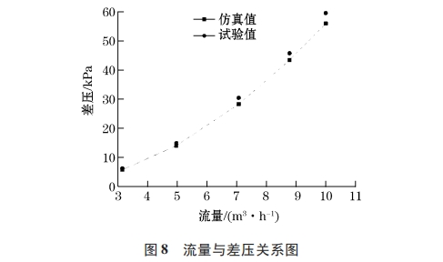 取5個不同大小的(de)流量按流速從小(xiǎo)到大,再從大到小(xiǎo),反複測量差壓值(zhí),測量次數爲3,測量(liang)結果取平均值對(duì)試驗測:量時得到(dào)的🧑🏽🤝🧑🏻流速進行模拟(nǐ)仿真,并與💃🏻試驗結(jie)果相比較。由此可(kě)得到如圖8流🏃🏻量與(yu)差壓關系圖。