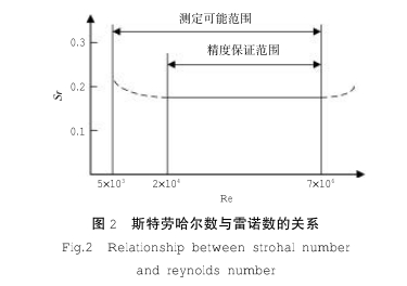 由公(gong)式可見,平均(jun1)儀表系數的(de)大小隻與渦(wo)街流量傳感(gǎn)☎️器幾何尺寸(cun)即渦街口徑(jìng)、阻擋體寬度(dù)與斯特勞哈(hā)🈲爾數sr有關。斯(sī)特🍓勞哈爾數(shù)與雷諾數的(de)關系如圖2所(suo)示🈲,可見,當雷(lei)諾數Re在2x104~7x106之間(jian)時,Sr可視爲常(chang)數。也就是說(shuo),對于一台口(kǒu)徑、阻擋體幾(ji)何尺寸已經(jing)确定的渦街(jie)流量計🙇🏻,它的(de)儀表系✍️數在(zài)一定的流速(su)範圍内是定(ding)值的。