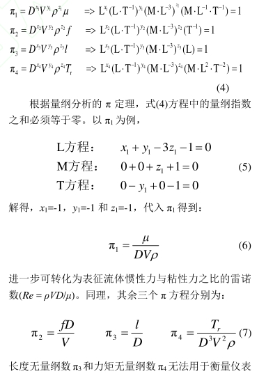 七個選定的變(biàn)量中流速V、流量(liang)計的尺寸D和l決(jue)定了儀表本身(shen)的🔞性能。流體物(wù)性p、μ和阻力矩T;影(ying)響儀表的實際(ji)性能🍉。七個變量(liang)包含三個量綱(gāng)單位(L、M和T),故選擇(zé)三個變⛱️量(D、V和p)作(zuò)爲基本♋變量。四(sì)個π方程(7個變量(liang)-3個量綱單位=4個(ge)方程)如式🌈(4)所示(shi)。