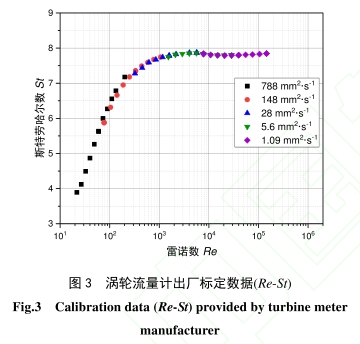 将雷諾數作(zuò)爲标定數據的(de)橫坐标,代表标(biao)準流量值,将💜斯(si)🐕特✔️勞哈爾數作(zuò)爲标定數據的(de)縱坐标,代表流(liu)量計對💜于标準(zhǔn)流🏃🏻♂️量值♍的輸出(chū)響應。渦輪流量(liàng)計🔞出廠标定數(shù)據的Re-St散點如圖(tú)3所🔆示,流量計在(zai)不同粘度介質(zhì)下的輸出響應(yīng)被重整🤞爲一條(tiao)和雷諾數有關(guān)的曲線,而且在(zai)一個阈值(Re=16400)以上(shàng),斯特✂️勞哈爾數(shu)變化範圍小于(yú)💁0.5%。這意味着,即使(shǐ)校準和工作場(chǎng)合使用💜的介質(zhi)粘🍓度不同,隻要(yao)雷諾數超過🏃🏻♂️這(zhè)個阈值,經過校(xiao)準的流量計示(shi)值的不确定度(du)仍然比較低。
